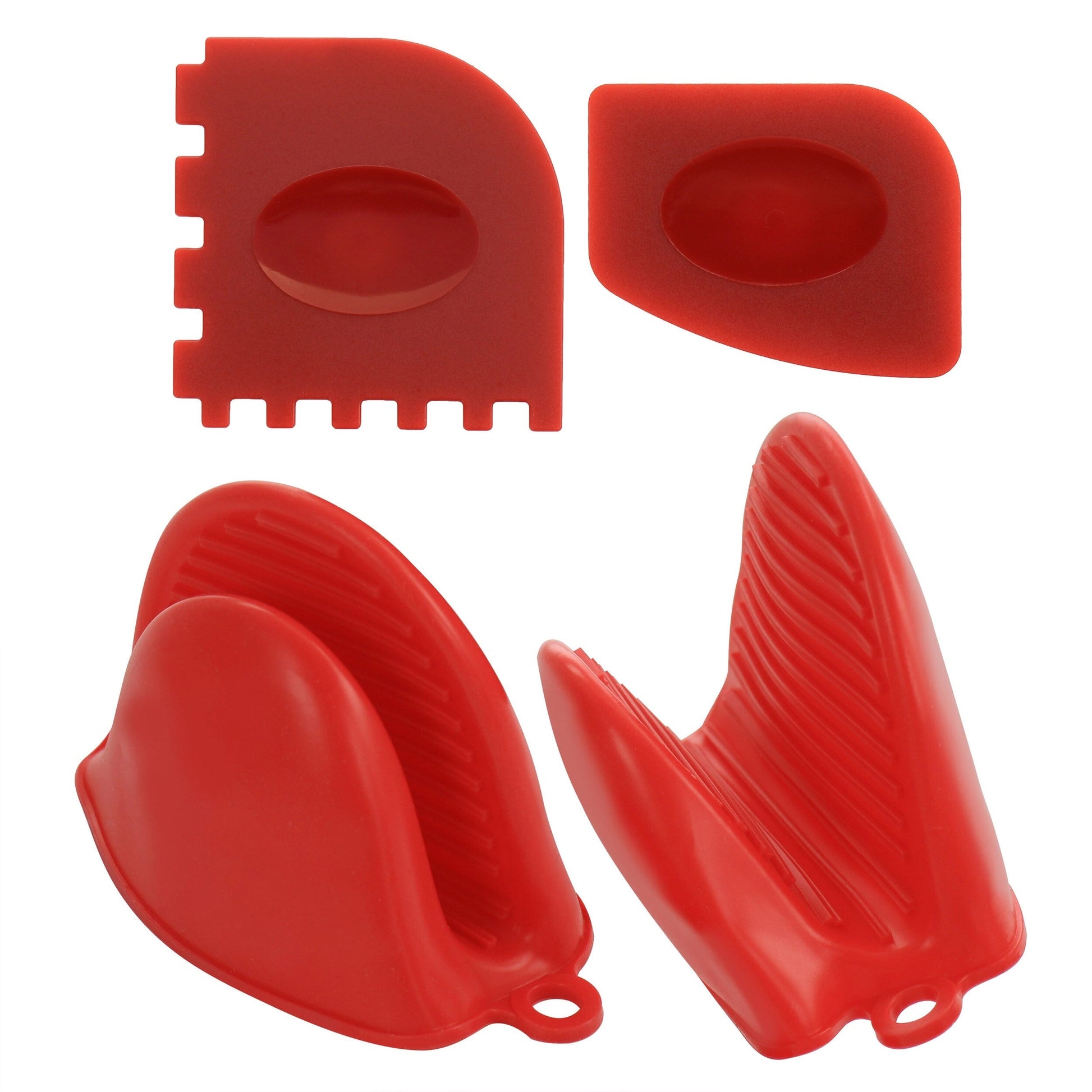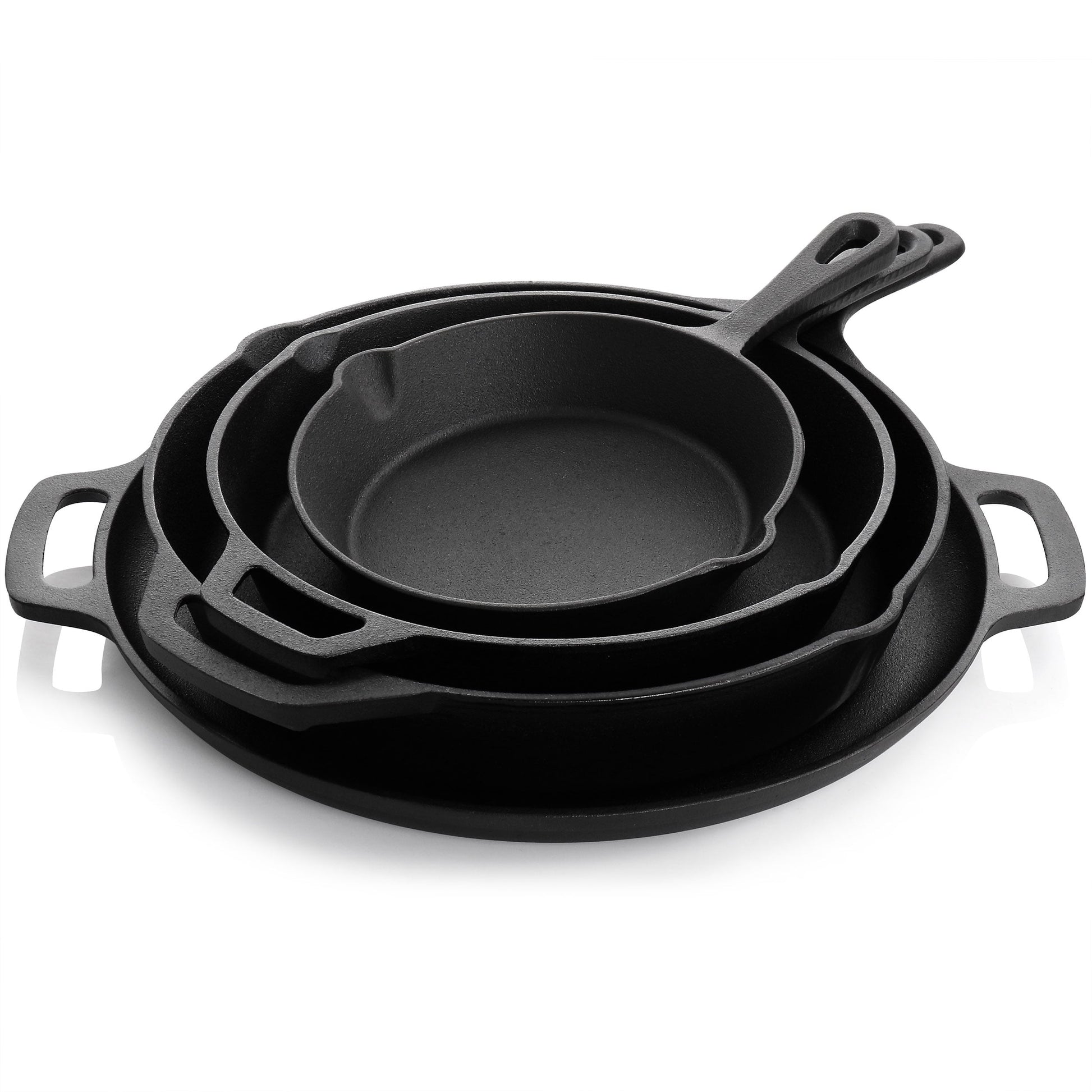 The 12 piece preseasoned cast iron cookware set comes with all your cooking essentials, from storage to frying pans. Cast iron construction provides the most even heat distribution for improved cooking, frying, sauteing, baking, grilling, broiling, braising and more! This essential cast iron set comes with three frying pans of varied sizes, one dutch oven with lid that can be turned over and used as an additional fry pan, two silicone grips, two scrapers, one silicone handle cover, and one storage organizer. Each piece comes pre-seasoned to prevent any rust while in storage and for immediate use. The continuous baking-in of oils make for an increasingly non-stick finish will provide extra layers of strength to make this cookware last a lifetime. Silicone mits provide safe handling while pans are hot. Scrapers make cleaning a breeze and can also be used to assist in baking, cooking, or scrubbing. Quality metal rack provides storage options, place right in your cabinet or use to add countertop storage to your kitchen.Material: Pre-seasoned Cast IronColor: Black/RedCast iron provides even heating for consistencyDutch oven lid doubles as an additional fry panSilicone grips for safe handlingHand wash only, dry immediatelyOven Safe 450 Degrees7.87 Inch Skillet10.23 Inch Skillet with Handle11.81 Inch Skillet with Handle13.77 Inch Pizza Pan10.23 Inch Casserole with Lid2 Piece scraper setOne silicone handle cover2 Piece silicone mittsOne metal shelf pan organizerPer Item Measurements:Casserole- 12.7in length, 10in diameter, 4.5in height, 8.10lb weightCasserole lid/pan- 12.7in length, 9.5in diameter, 1.7in height, 3.40lb weightSmall skillet- 12.25in length, 8.1in width, 1.5in height, 2.5lb weightMedium skillet- 15.9in length, 10.5in width, 1.9in height, 4.7lb weightLarge skillet- 18.1in length, 12.4in width, 2.25in height, 7.05Pizza pan- 16.4in length, 13.4in diameter, 1.1in height, 7.10lb weightPan organizer- 11.75in length, 7.9in width, 16.6in height, 3.5lb weightSilicone mitts- 3.25in length, .5in width, 1.8in height, 0.05lb weight eachScraper- 3.2in length, 3.25in widthSmooth scraper-2.25in length, 3in width
