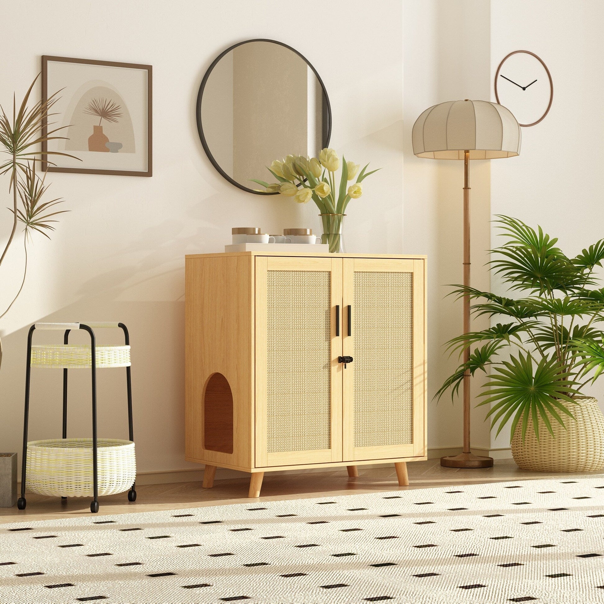 【4-in-1 Multi-Functional Cat House:】This 2-door rattan cabinet serves as a versatile cat house that meets various needs. It not only conceals your cat's litter box but also provides a private and comfortable space for your furry friend. Additionally, it functions as a storage cabinet for pet snacks and toys, as well as a practical side table bathroom cabinet or nightstand that seamlessly blends with your home decor.