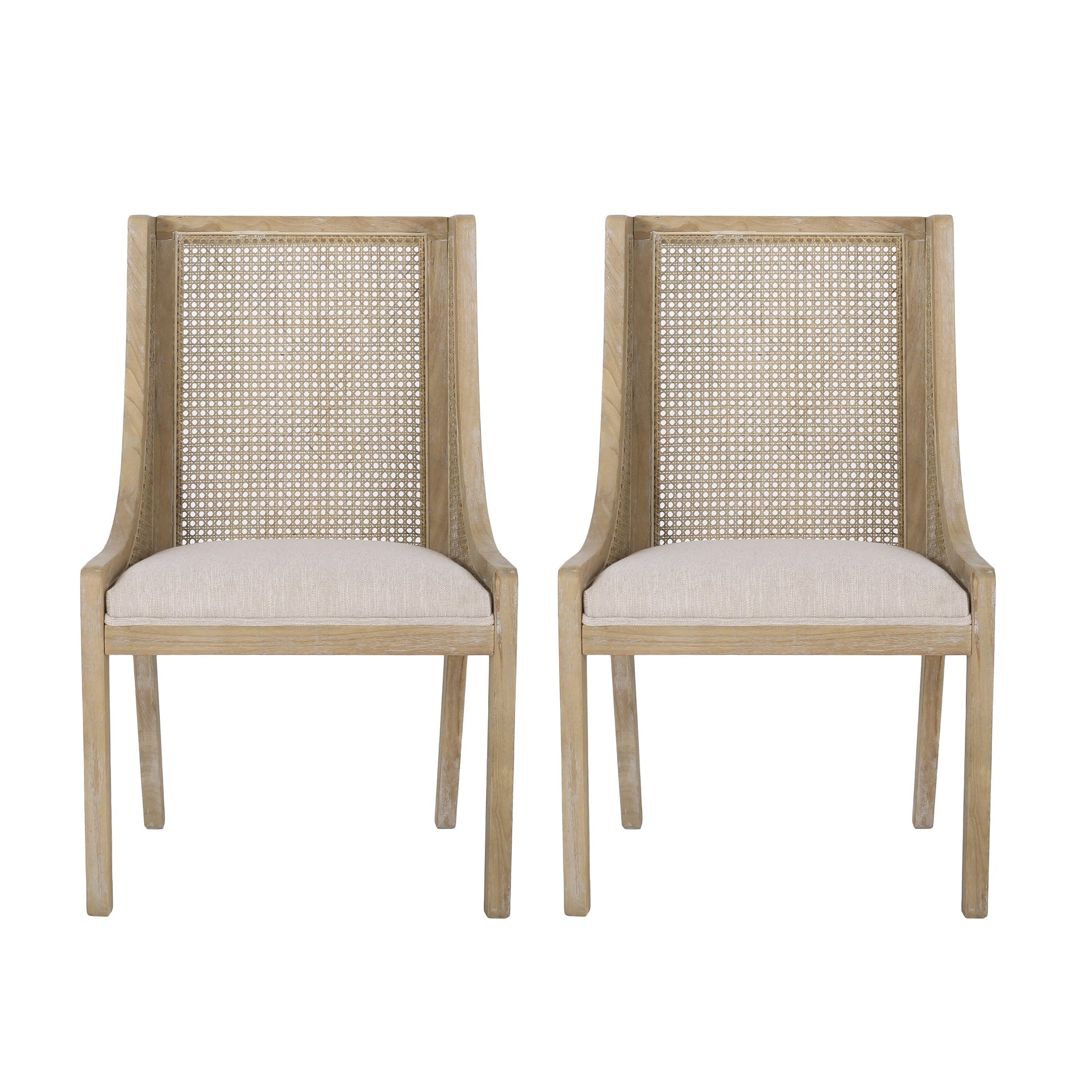 Bring home a splash of countryside character that is overflowing with outstanding textures and inviting design. Drawing from a charming rustic inspiration, our delightful set of dining chairs features gorgeous backrests made with cane webbing, smooth upholstered seating, and gracefully sloped arms, offering a rugged, natural beauty to your dining area. Each chair offers purposely weathered wood frames that showcase wonderfully contrasting lines and curves to encourage both casual meals with your family and extravagant dinner parties with your guests.