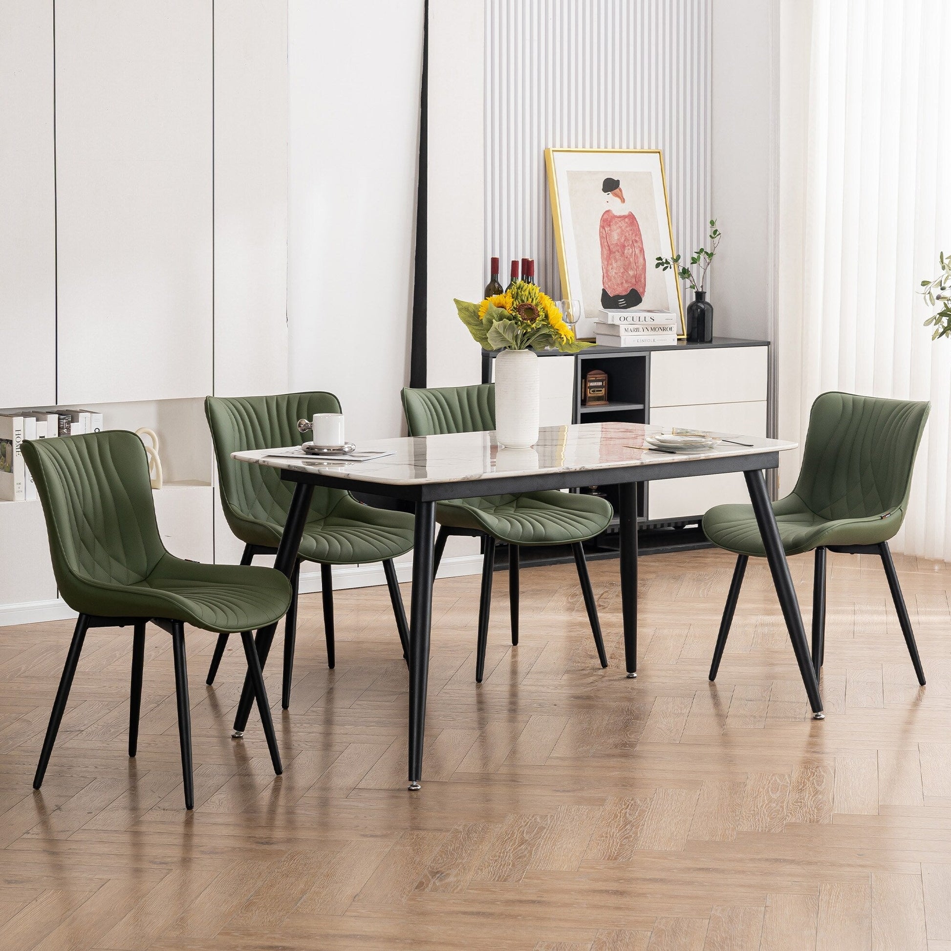 💞Surround your dining space with a set of dining chairs that not only bring your decor to life, but also conform to your body's curves for added comfort. Featuring lovely whales' tail stripe, leather upholstered seats and sturdy metal frames for durability, this dining chair's multi-materials accentuate the overall contemporary style. With no arms, our sophisticated dining chairs can be easily nestled into table voids to save space and are the perfect balance of stunning style and convenient functionality. These kitchen dining room chairs are versatile and suitable for a variety of settings, including dining rooms, kitchens, living rooms, guest rooms, waiting rooms and even vacation homes. They can be used as cozy reading chairs, comfortable corner cushions, makeup chairs, lounge chairs etc.