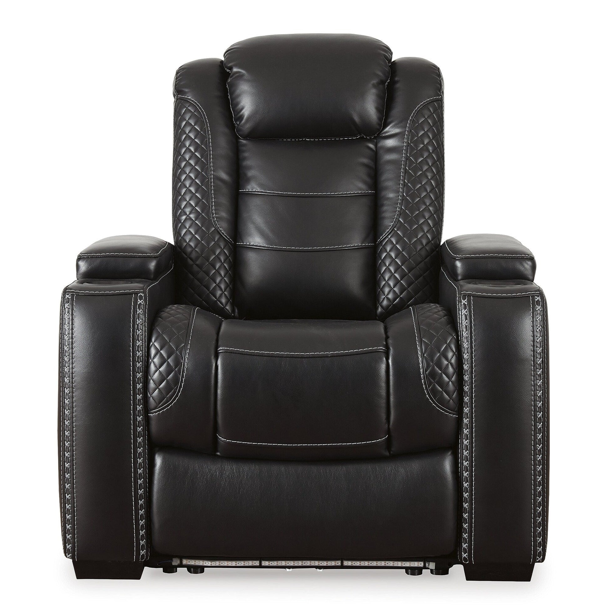 Need a fun, relaxing spot to unwind and watch TV? You'll find that space with the Party Time power recliner with adjustable headrest. In a midnight-colored polyester upholstery with cross hash stitching, lattice accents, and LED lighting, it has a fabulously modern look. When it comes to comfort, you'll love the reclining bucket seat and its adjustable power headrest that delivers a personalized comfortable angle for TV viewing. It's convenient too—sporting lighted cup holders, built-in power button with USB port on control, flip up padded armrest with hidden storage underneath and lower LED lighting. It's certain to become a hit in any home. How could you only get one?